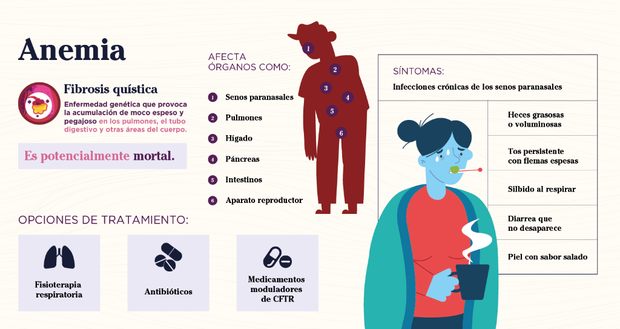Entre los síntomas más comunes se encuentran las infecciones pulmonares recurrentes, tos con mucosidades espesas, sudor excesivamente salado, crecimiento lento, cansancio constante, heces grasosas o voluminosas y obstrucción intestinal.